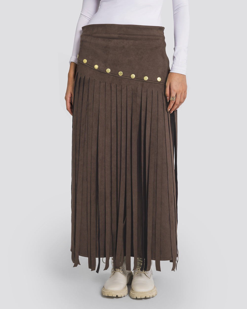This suede skirt features stud detailing at the waist and playful fringes that sway with every step.
