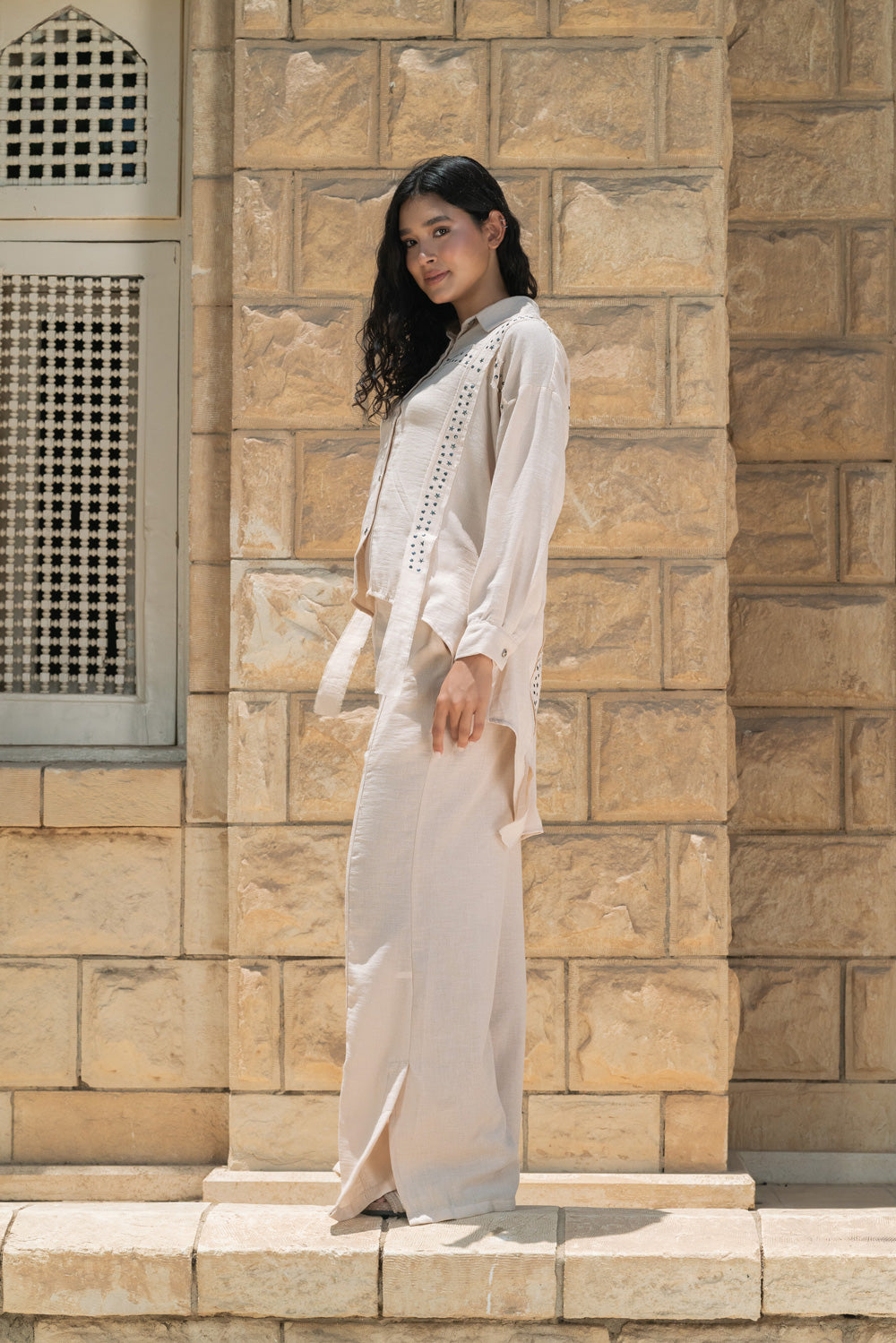 Crafted from a breathable, linen-like fabric, this two-piece set blends comfort with subtle detail.