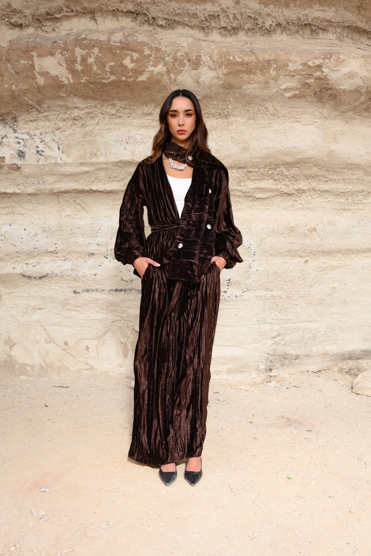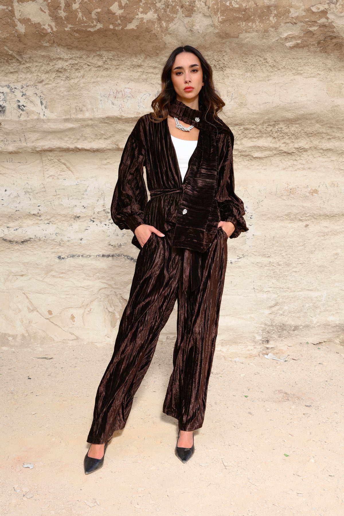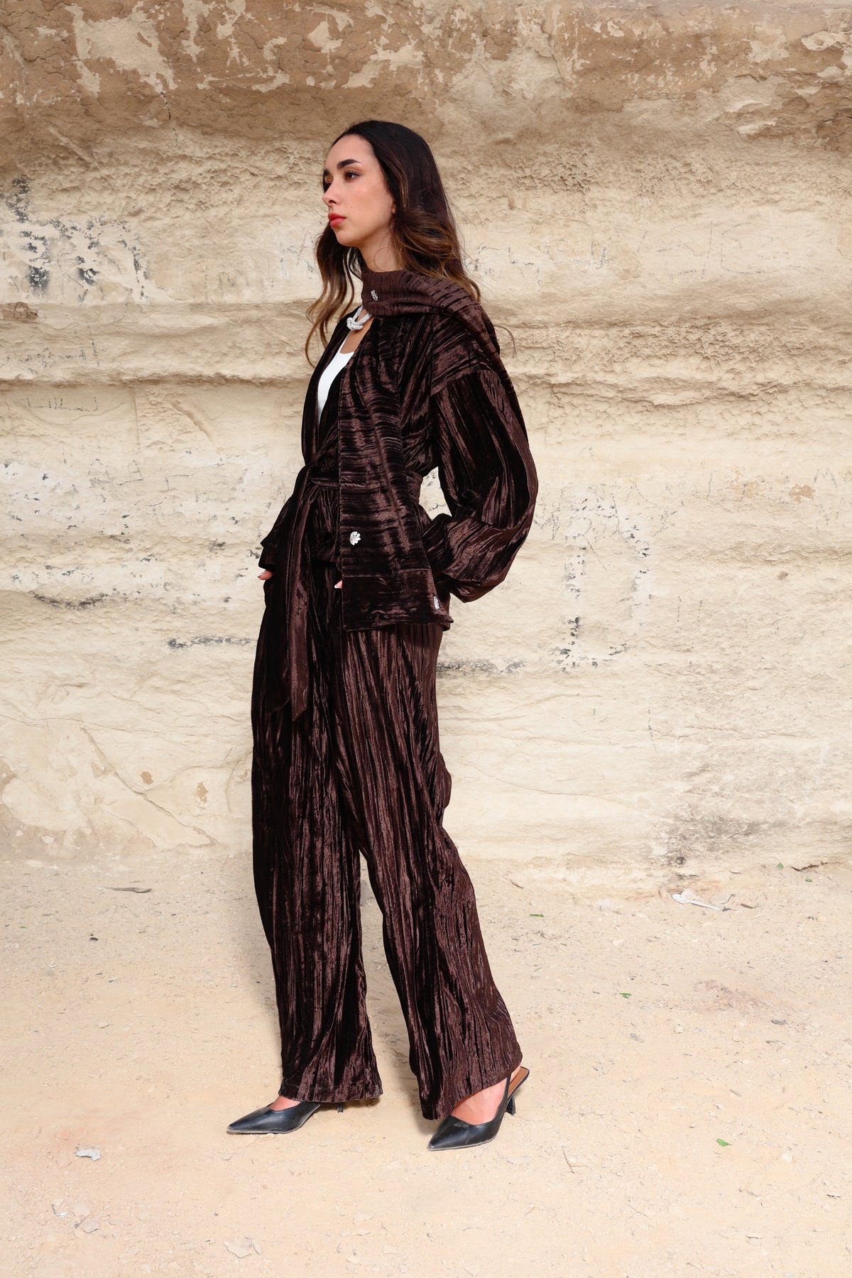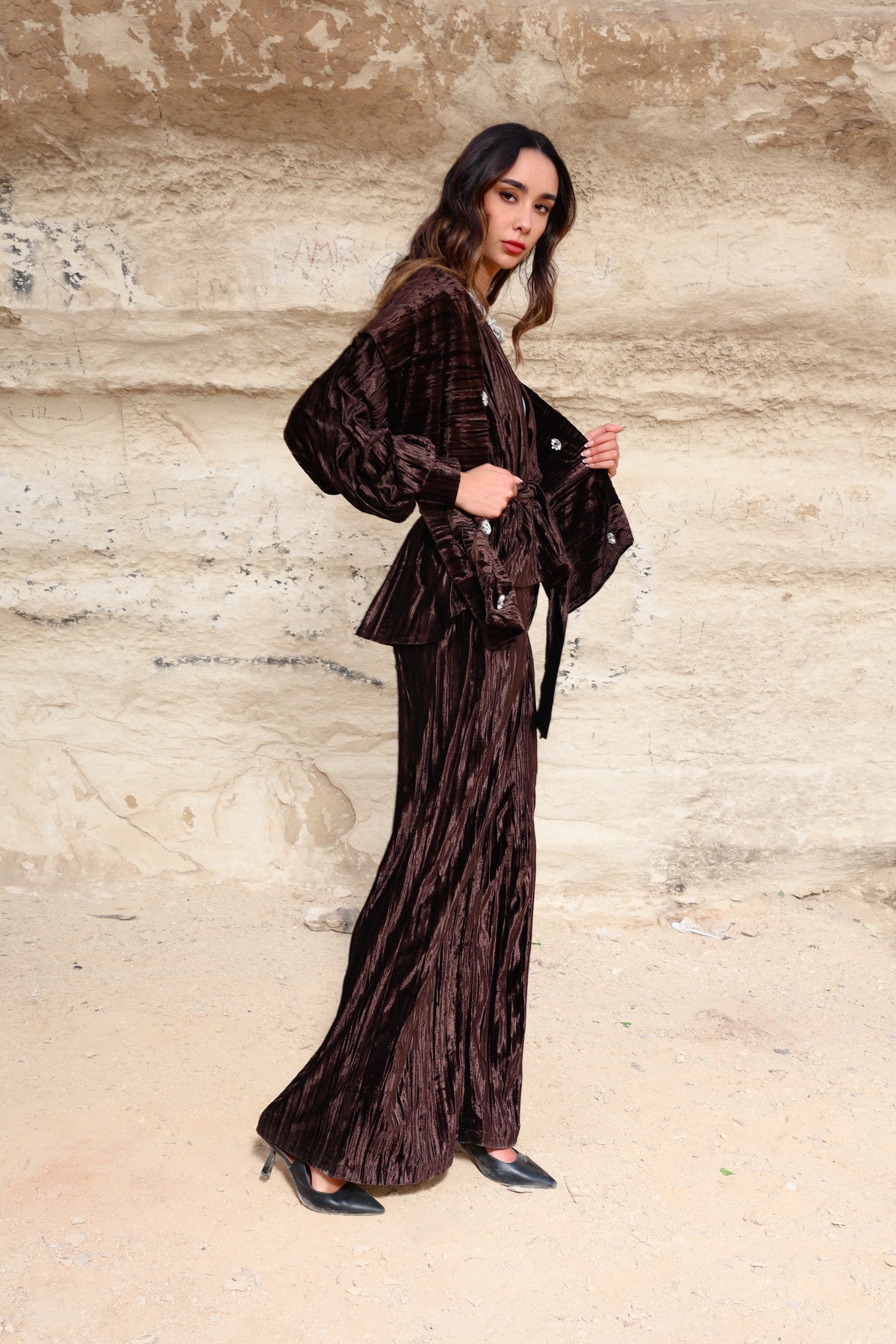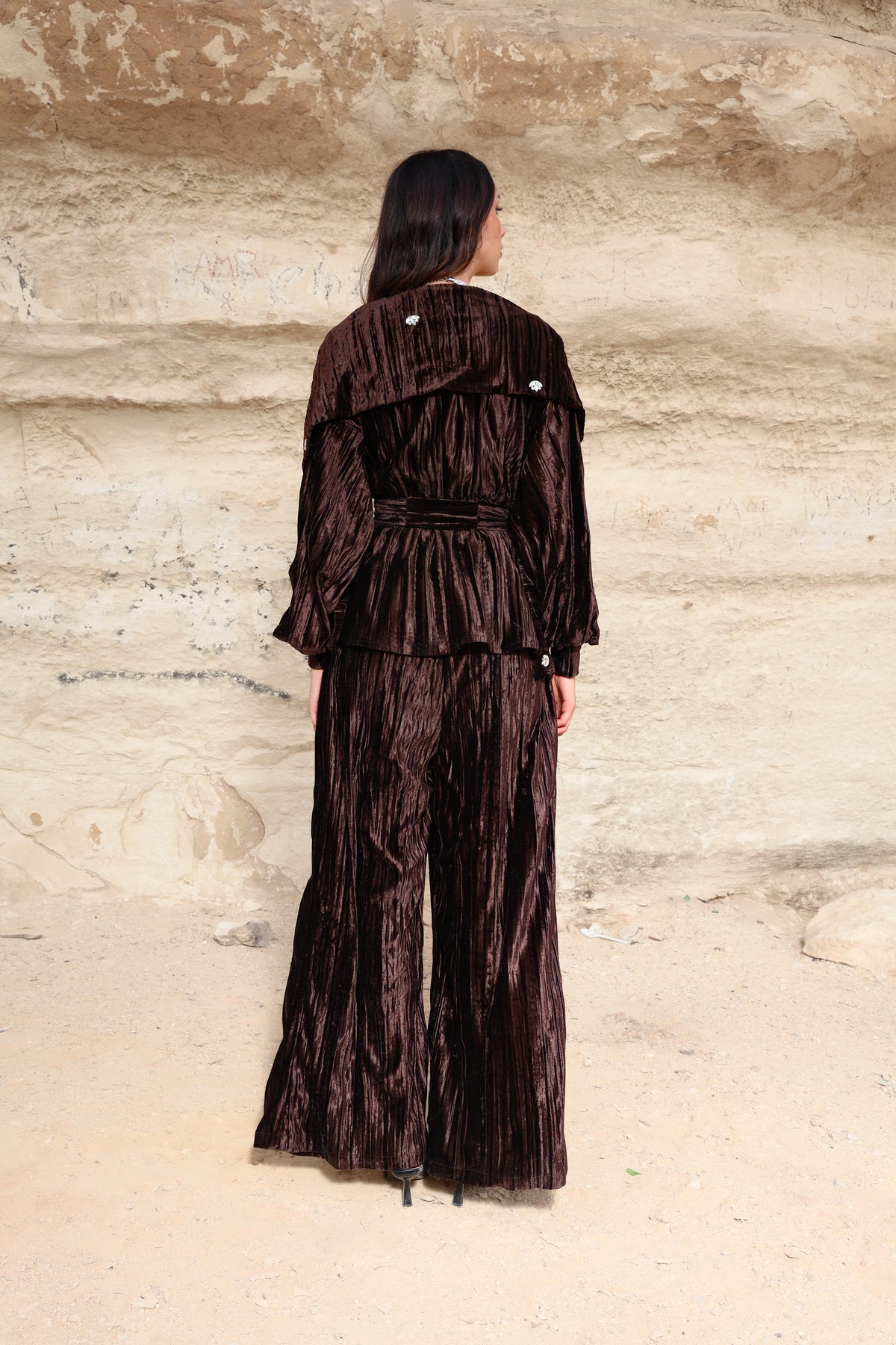 A rich velvet brown set designed to embody elegance and sophistication. Crafted from premium velvet fabric, this piece offers a soft, luxurious feel with a graceful silhouette that flatters effortlessly.
