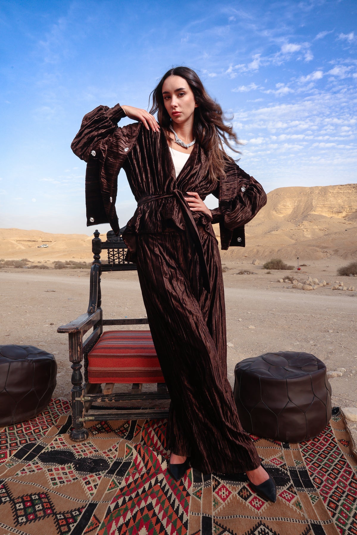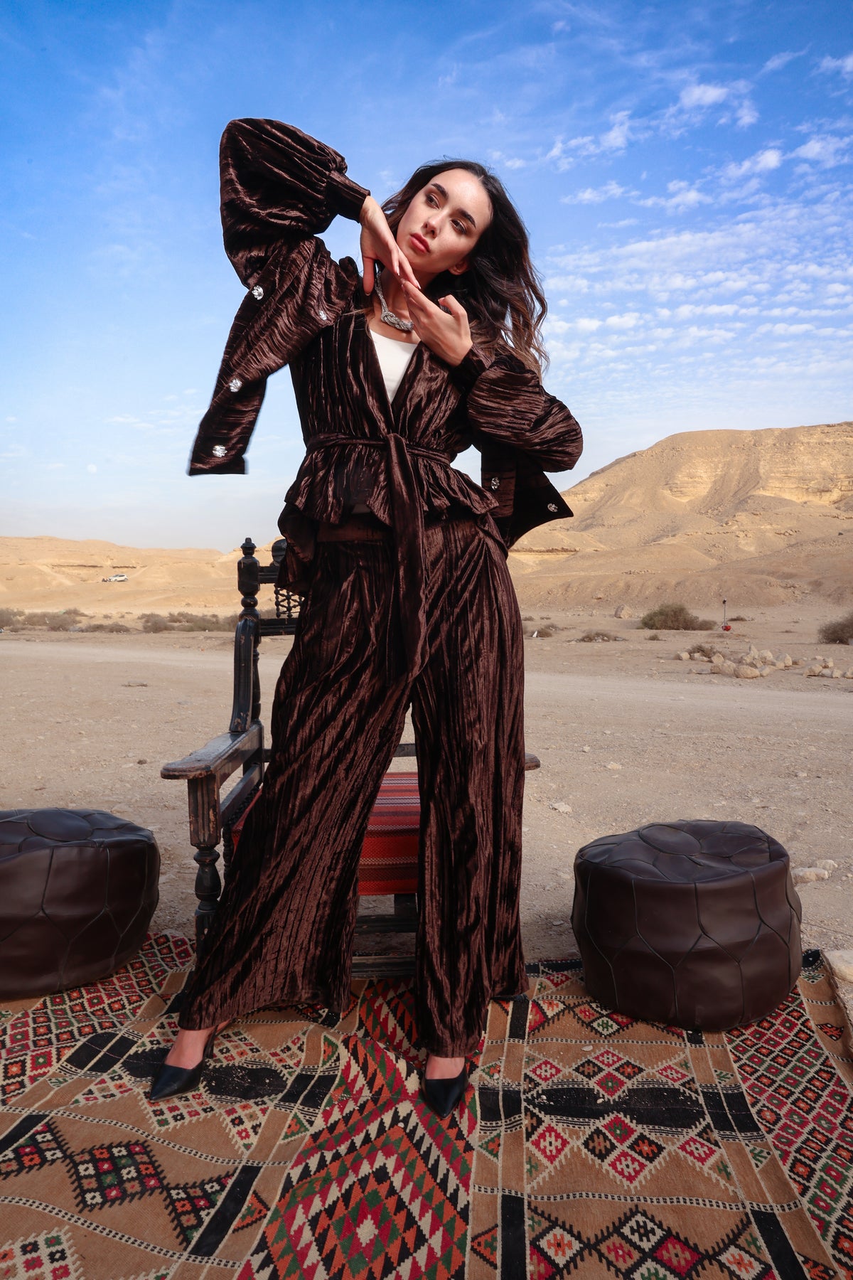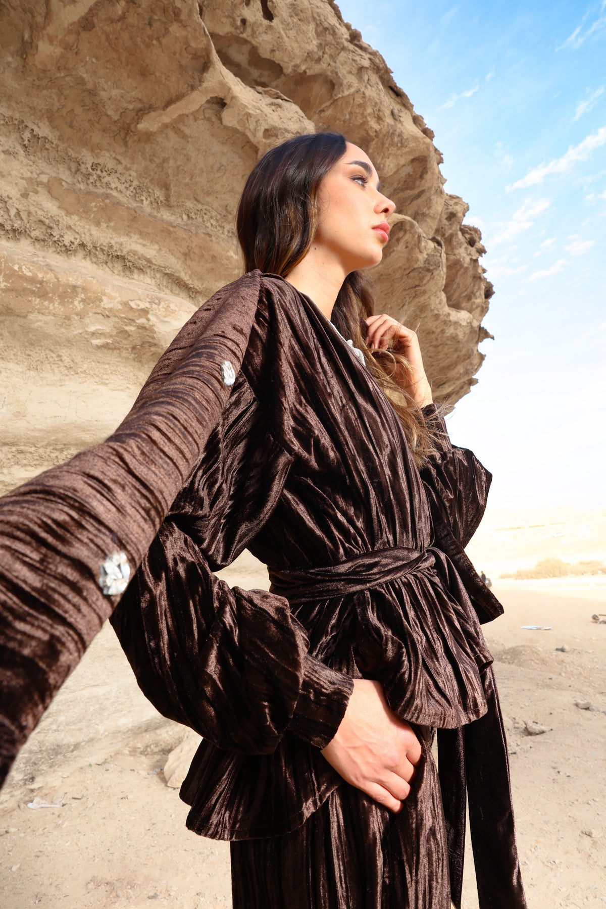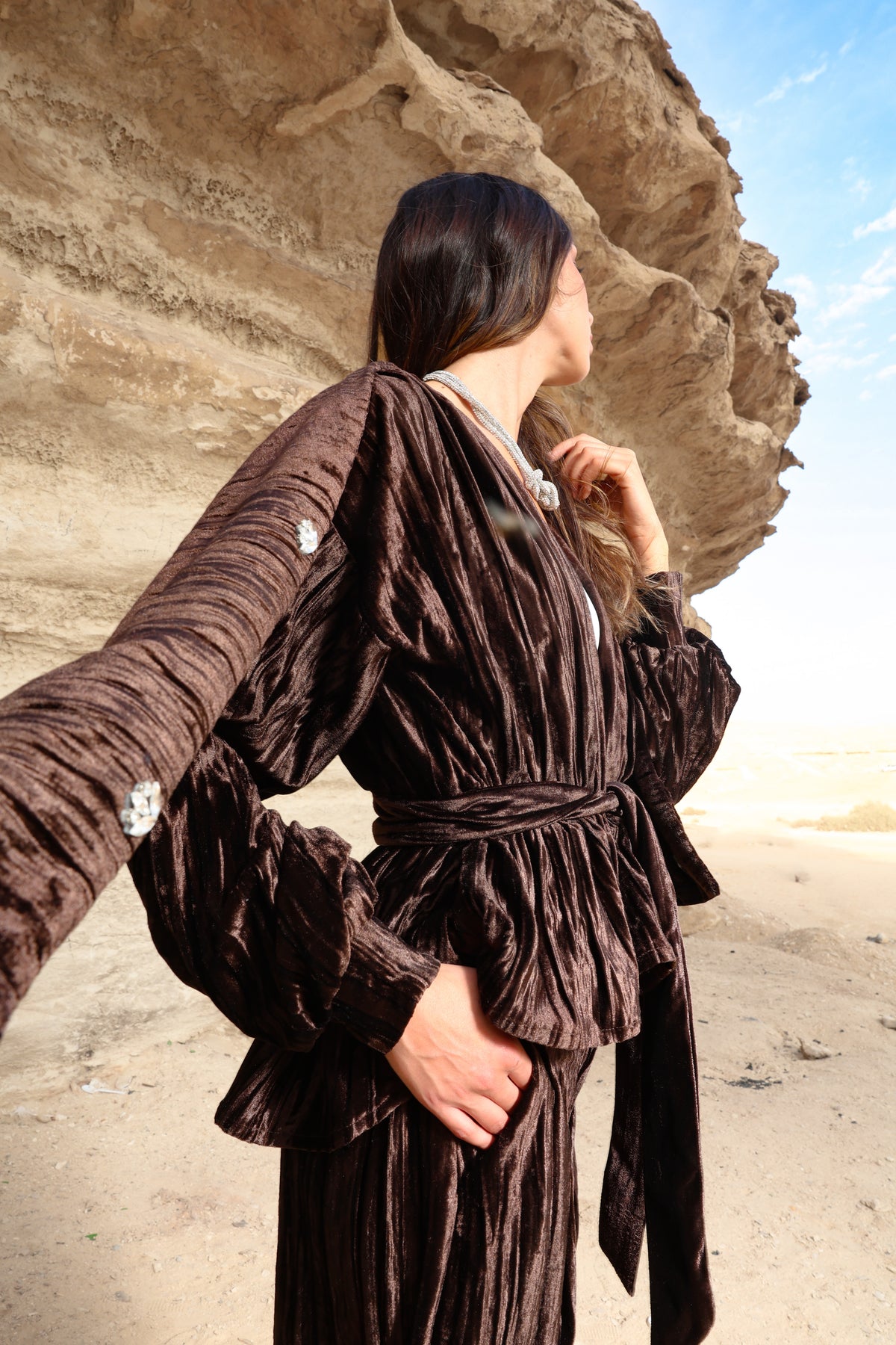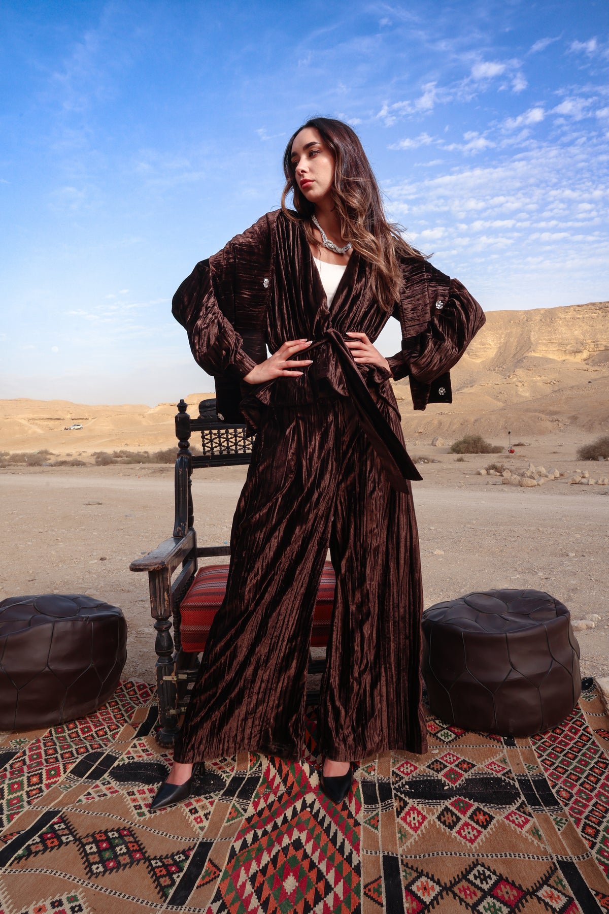 A rich velvet brown set designed to embody elegance and sophistication. Crafted from premium velvet fabric, this piece offers a soft, luxurious feel with a graceful silhouette that flatters effortlessly.