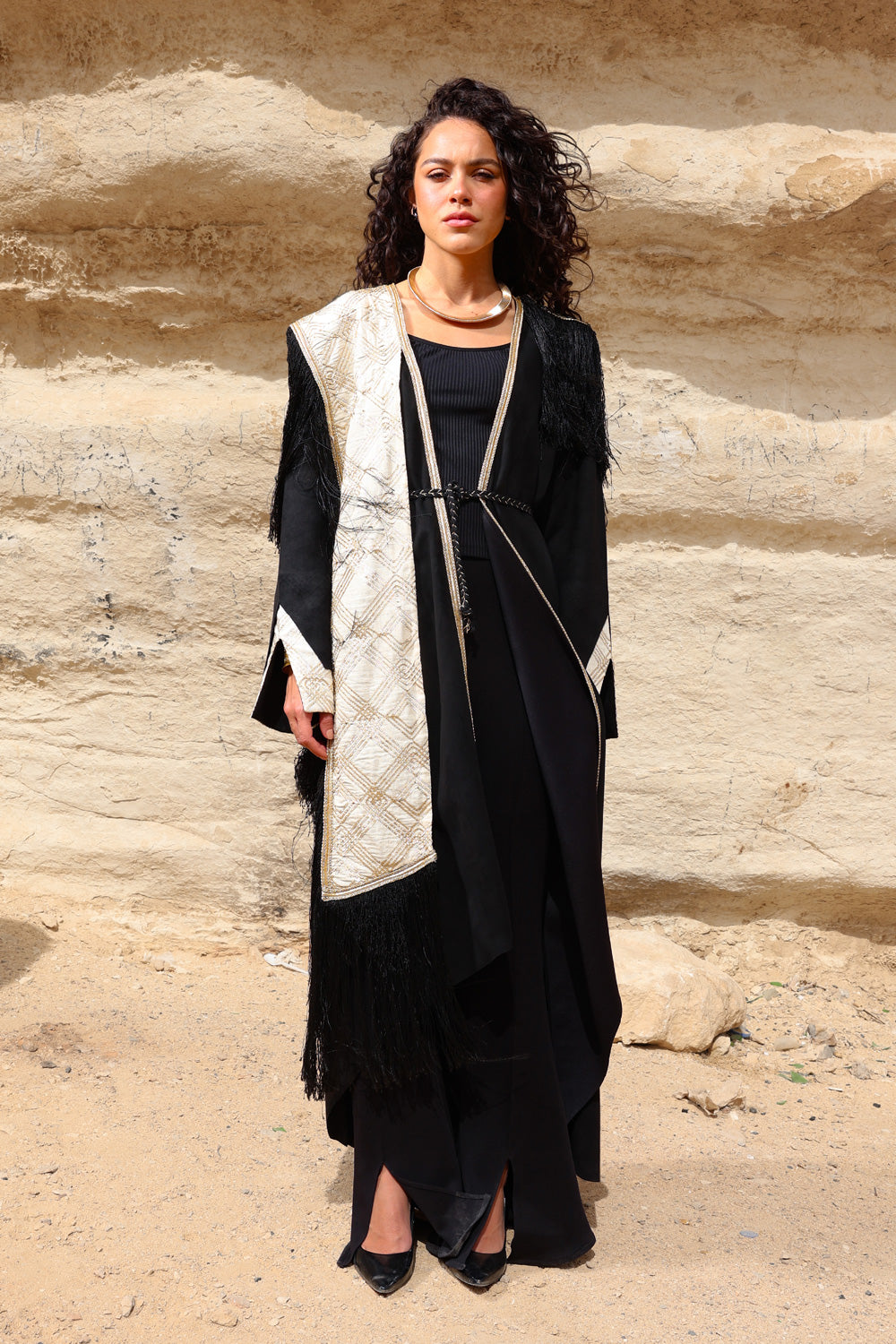 A high-low abaya crafted from soft suede, featuring an attached scarf that flows from the back with delicate fringes.
