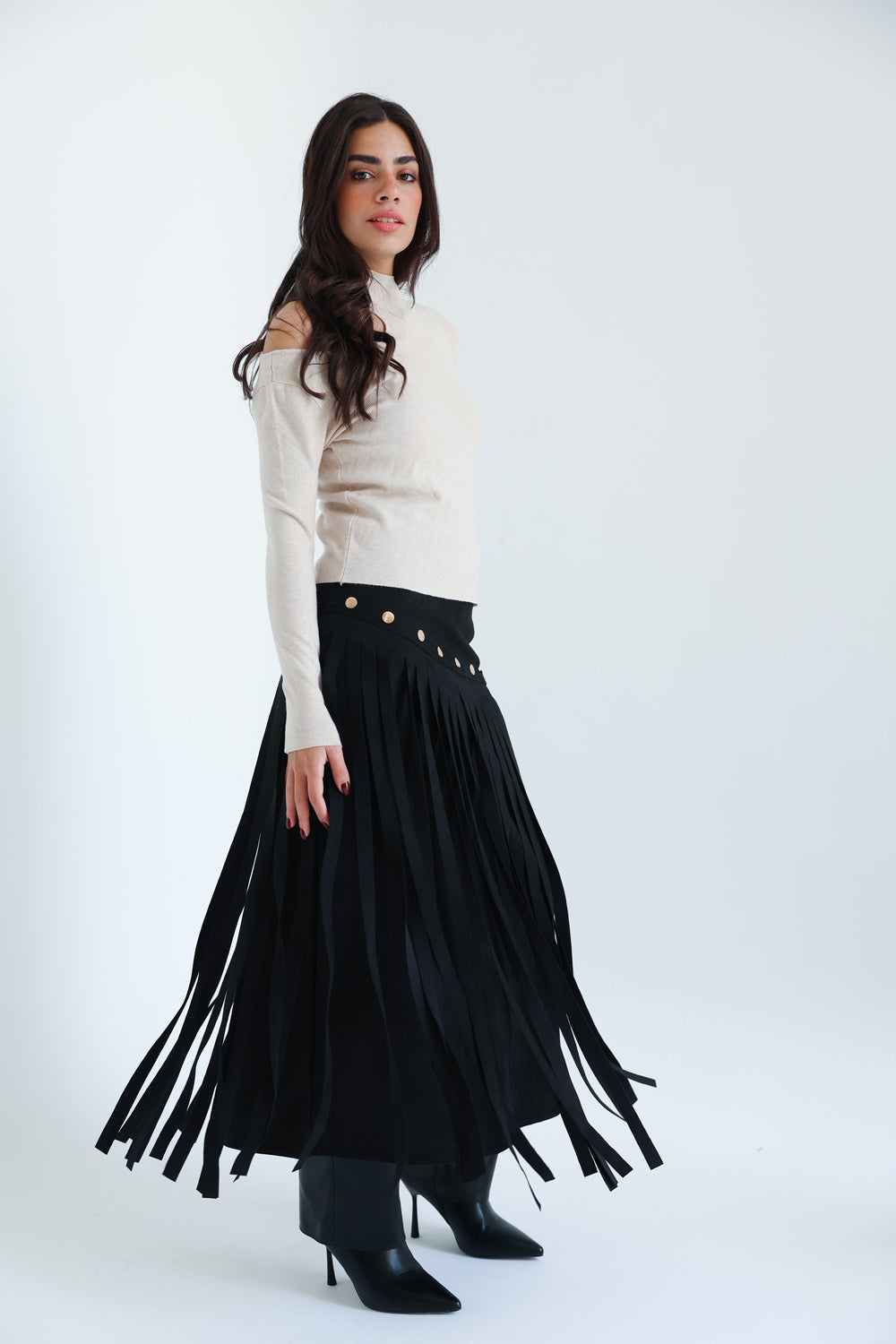 This suede skirt features stud detailing at the waist and playful fringes that sway with every step.