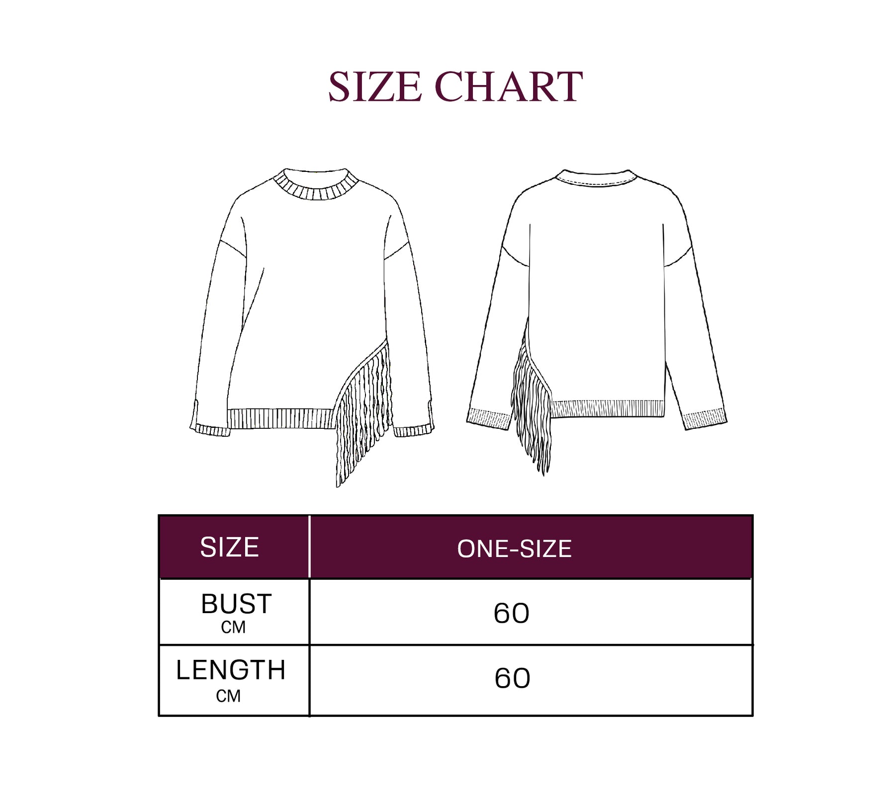 Designed with playful fringes along the sides and subtle slits at the cuffs, it combines comfort with effortless sophistication.