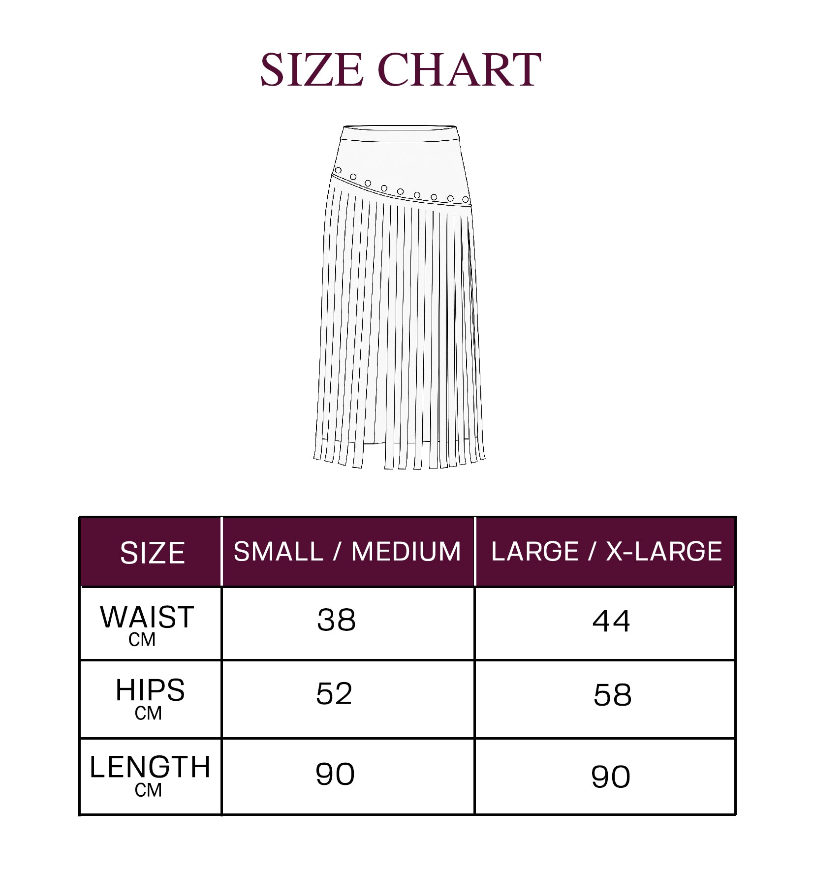This suede skirt features stud detailing at the waist and playful fringes that sway with every step.
